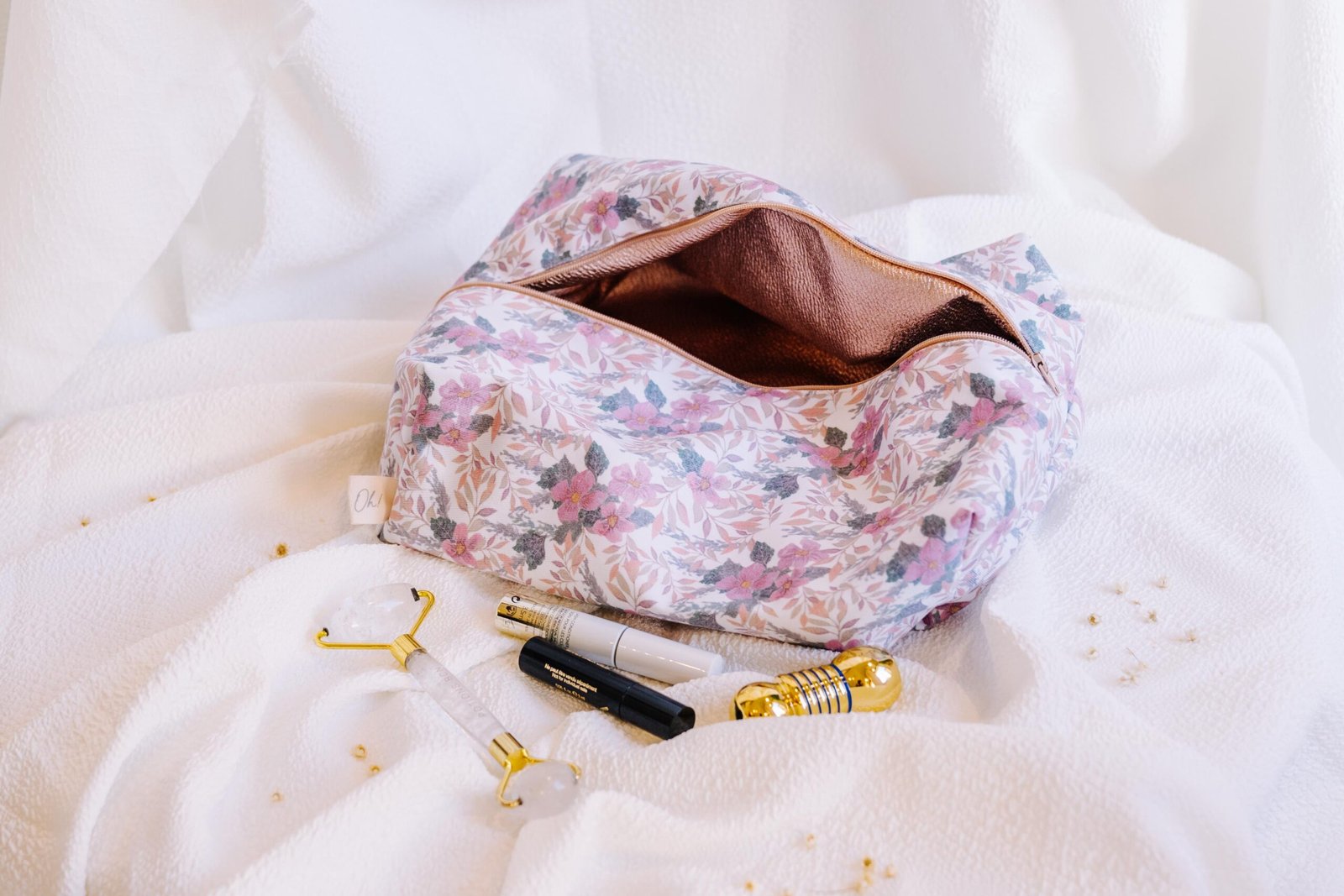 Estampado de flores único, dibujado a mano, forrado en tela plastificada en tono rosa empolvado. Hecho a mano.