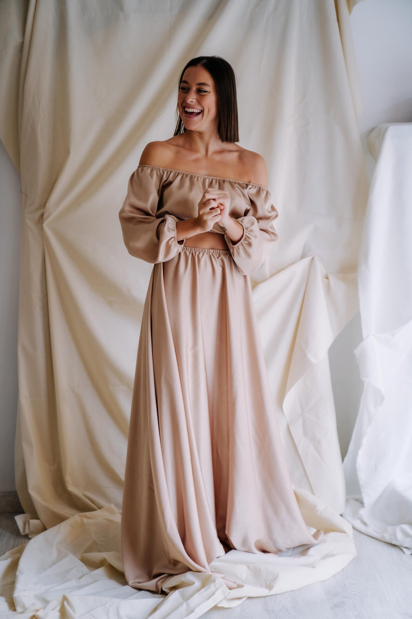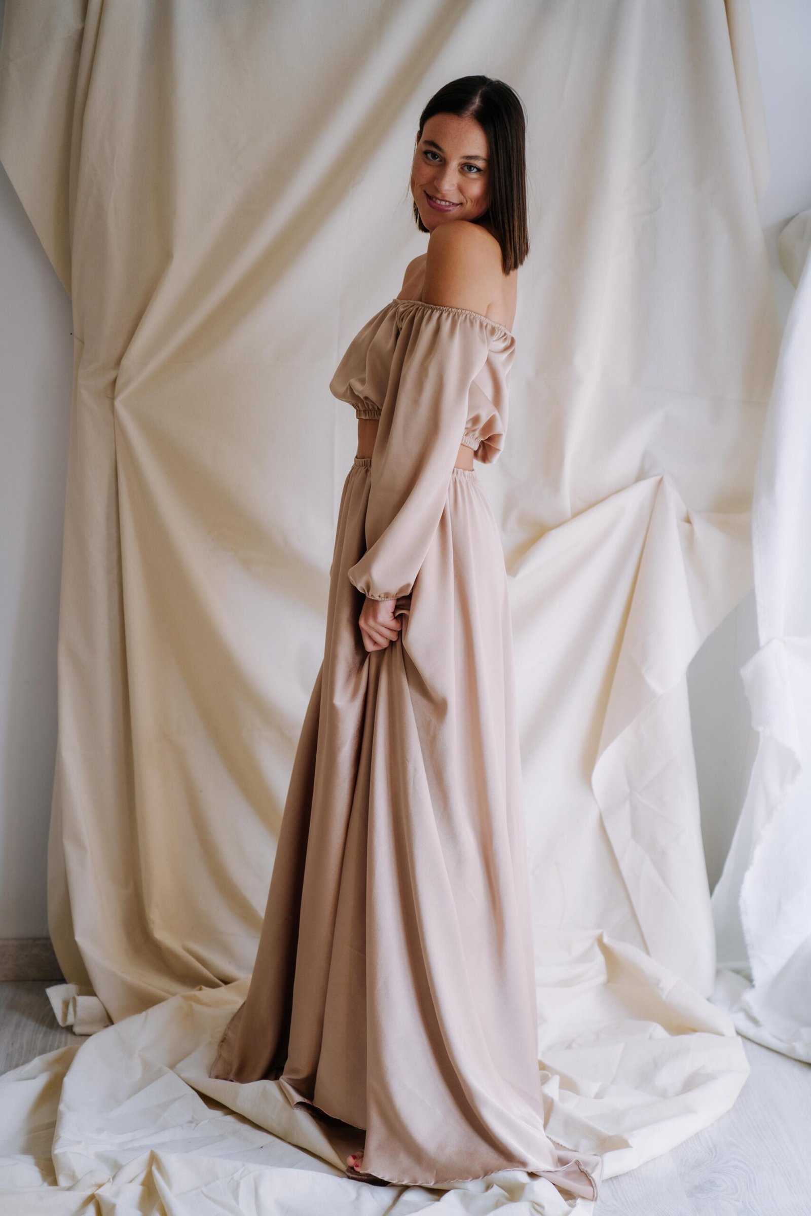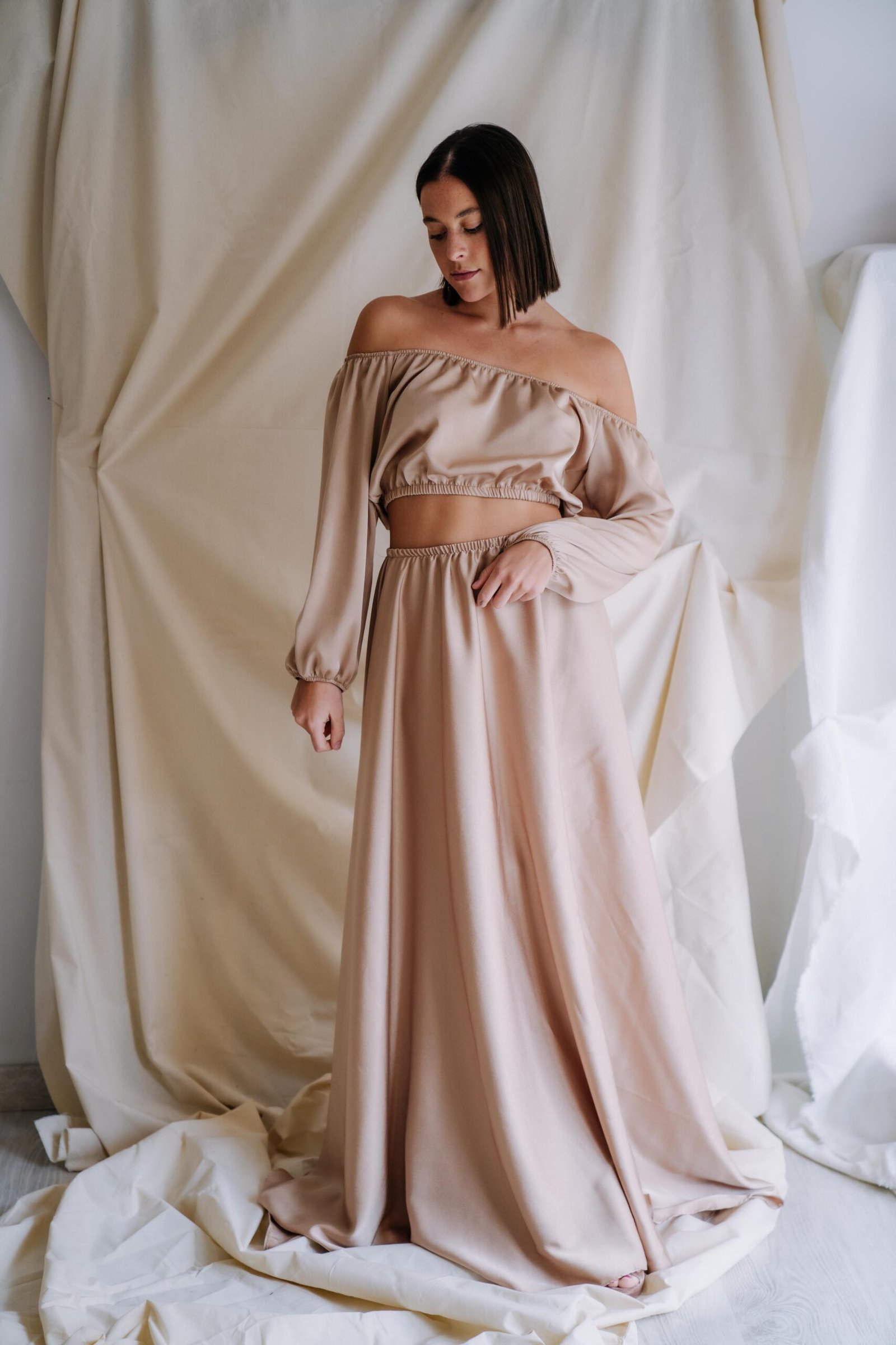 Vestido disponible en dos colores, champán o rosa pastel. Un vestido de dos piezas, con top con goma, mangas, y apertura lateral de la falda en satén.