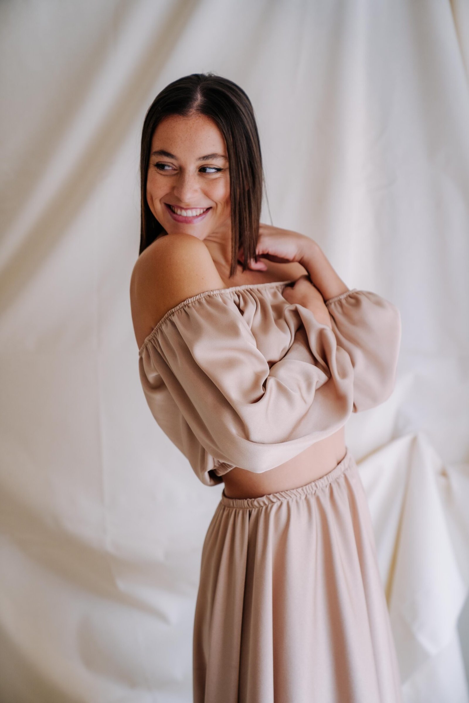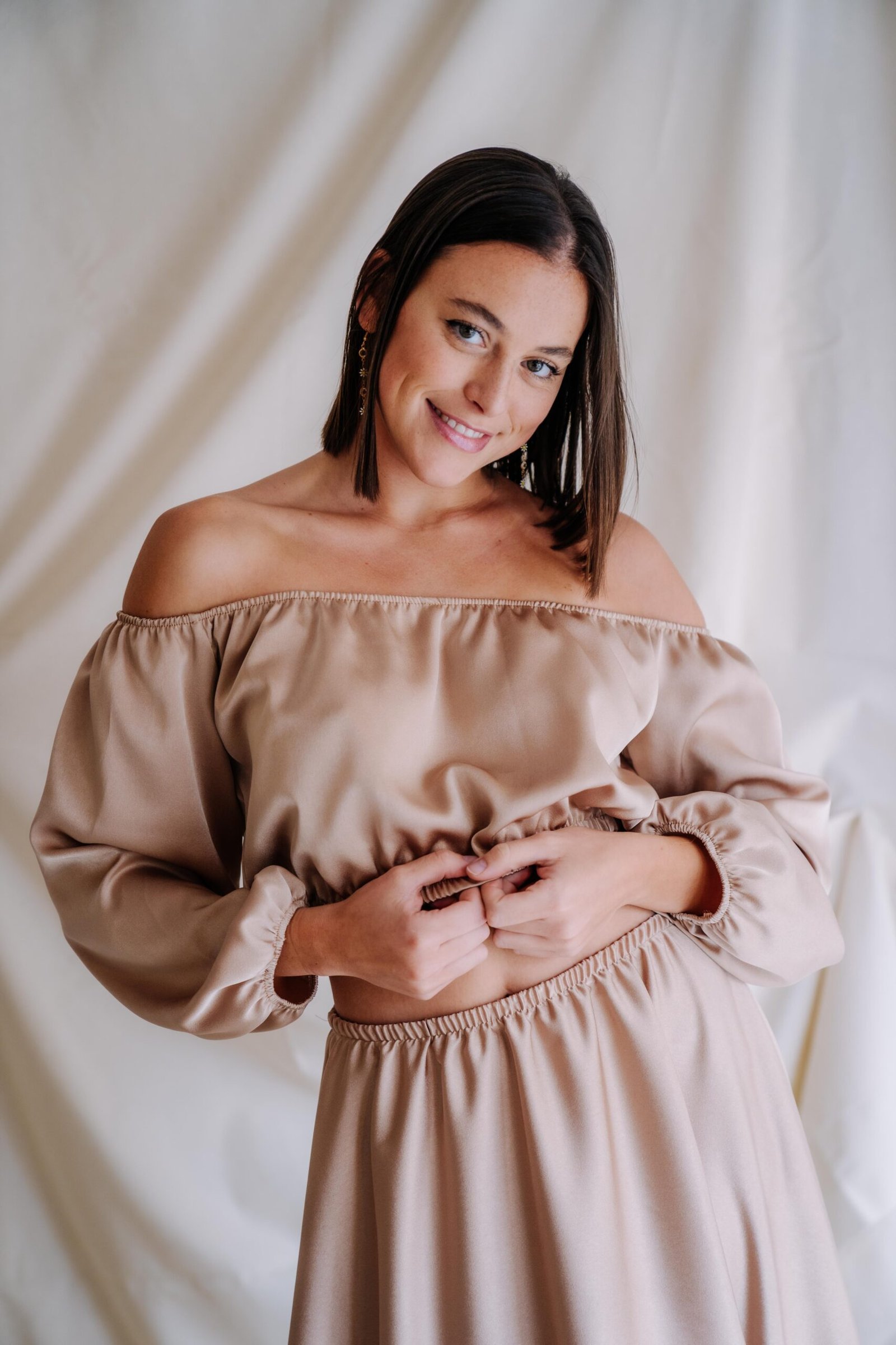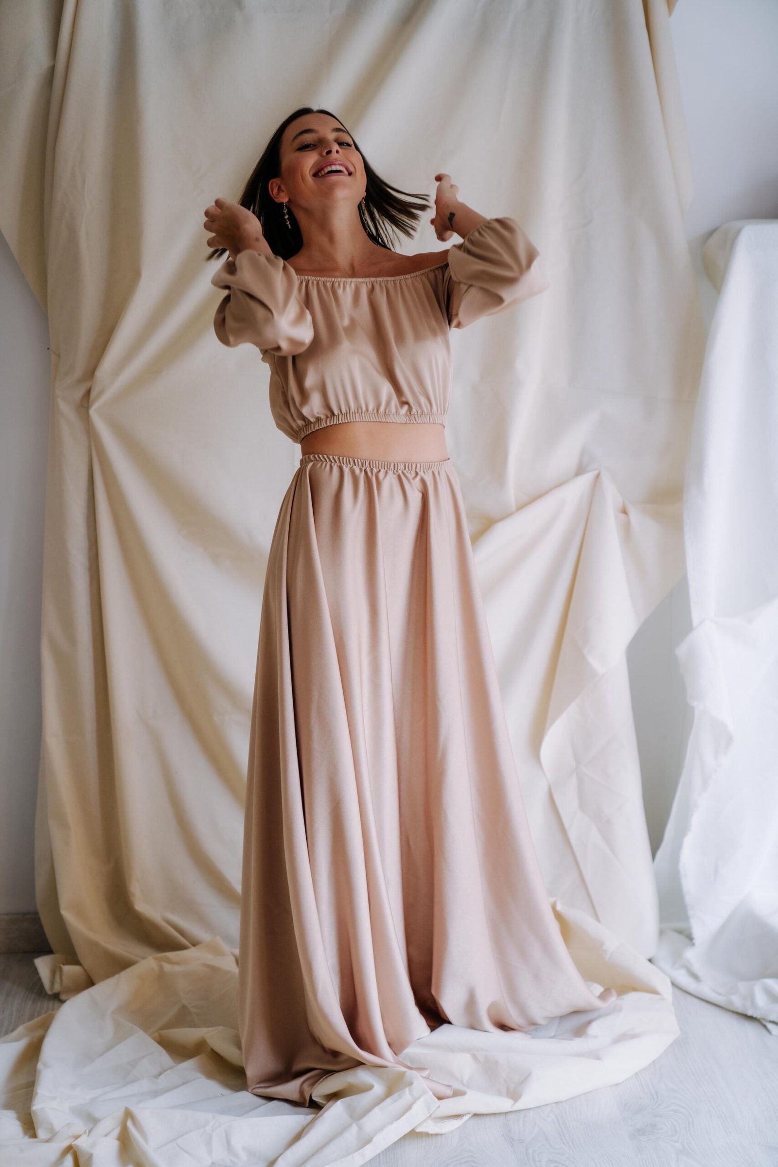 Vestido disponible en dos colores, champán o rosa pastel. Un vestido de dos piezas, con top con goma, mangas, y apertura lateral de la falda en satén.